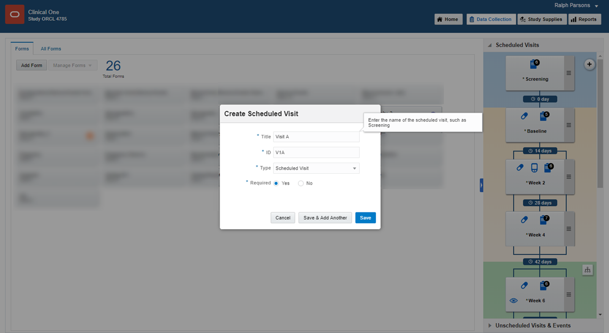 訪問スケジュールを定義する前に訪問を作成する必要があるため、訪問をスケジュールする順序で訪問を作成します。たとえば、予備選考、週1、週2などを作成します。