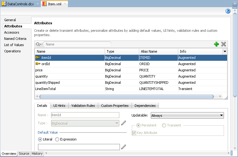 When you create a data control for your business services, you can create a data control structure file for an individual data object in which you can declaratively augment the functionality of the data object's persistent attributes. For example, you can create validation rules and set UI hints to control the default presentation of attributes in UI components. In addition, you can create transient attributes.