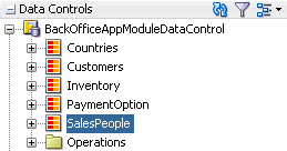 Each view object instance appears as a named data collection whose name matches the view object instance name. Figure 17-4 illustrates how the Data Controls panel displays the view object instances in BackOfficeAppModule's data model. The Data Controls panel reflects the master-detail hierarchies in your application module data model by displaying detail data collections nested under their master data collection.