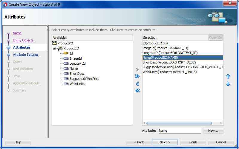On the Attribute Settings page, optionally, use the Select Attribute dropdown list to switch between the view object attributes in order to change their names or any of their initial settings.