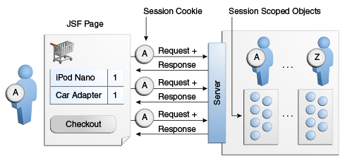 The ADF binding context is the one object that lives in the HttpSession for each end user. It holds references to lightweight application module data control objects that manage acquiring an application module instance from the pool during the request (when the data control is accessed) and releasing it to the pool at the end of each request. The data control holds a reference to the ADF session cookie that identifies the user session. In particular, business domain objects created or modified in the pending transaction are not saved in the HttpSession using this approach. This minimizes both the session memory required per user and eliminates the network traffic related to session replication if the servers are configured in a cluster.
