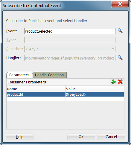 A contextual event is passed from the products region to the inventory region so that the showInventory-task-flow can display the DVT chart for the selected product. When you create a event for the producer component using the Properties window, a event is registered in the producer's page definition file. In the Summit ADF sample application, the productSelected event is registered in the showProductsPageDef.xml file, as shown in Example 40-1