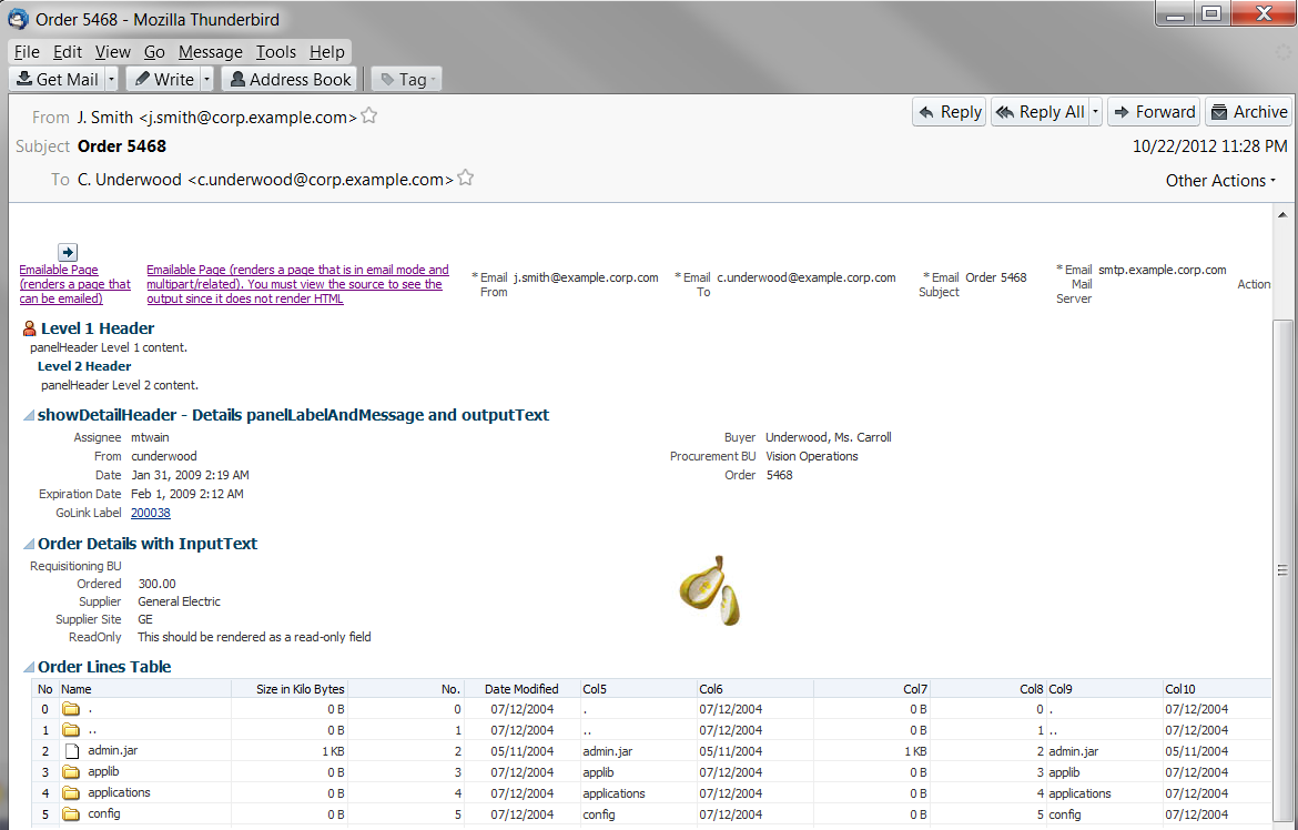 When the user clicks the Emailable Page link at the top, an actionListener method or another service appends org.apache.myfaces.trinidad.agent.email=true to the current URL and emails the page. Figure 37-4 shows the page as it appears in an email client.