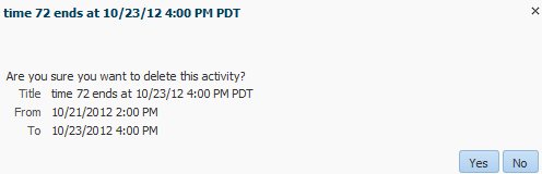 For example, when a user clicks on an activity in the calendar, the CalendarActivityEvent is invoked and the popup component in the ActivityDetail facet is opened. You might use a dialog component that contains a form where users can view and edit the activity, as shown in Figure 17-3.