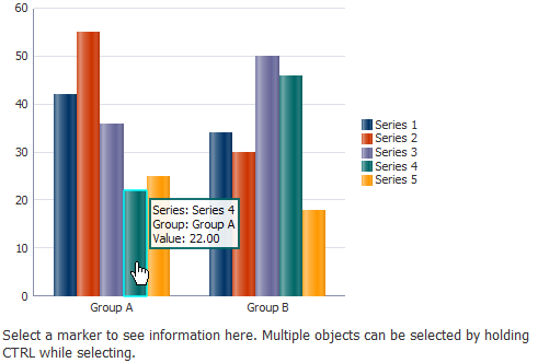 Figure 23-27 shows a bar graph enabled for selection. Each data marker is highlighted as the user moves over it to provide a visual clue that the marker is selectable.