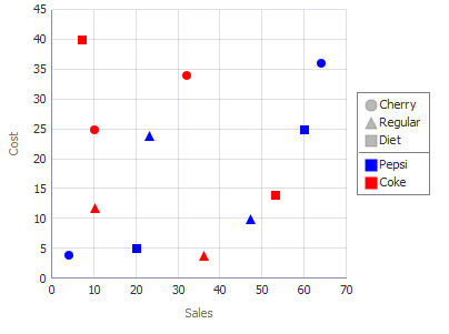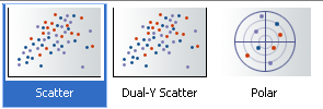 Scatter/Polar: Represents data by the location of data markers. Use scatter graphs to show correlation between two different kinds of data values such as sales and costs for top products. Use scatter graphs in particular to see general relationships among a number of items. A scatter graph can display data in a directional manner as a polar graph.