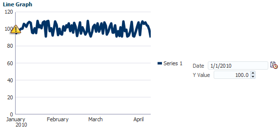 Graphs can be configured to associate a data reference area or line with a graph series or axis. Separately, graphs can be configured to define an additional data point that needs to be highlighted with a separate symbol, such as for an error or warning. Figure 23-29 shows a bar graph with a warning alert icon for each bar inside the alert range of the graph. The figure also illustrates an ADF input range slider that can be associated with the graph to change the reference area.