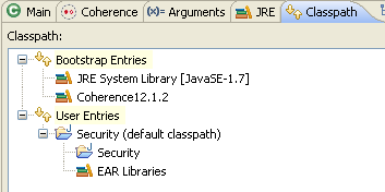 In the Classpath tab, remove Coherence12.1.2 from the Bootstrap Entries list if it appears there. Click Add External Jars to add the coherence.jar file to User Entries. Move the Security folder to the top of User Entries followed by the coherence.jar file if it does not already appear there. When you are finished, the Classpath tab should look similar to Figure 10-7. Click Apply then Close.