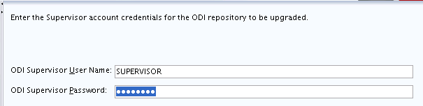 On the ODI Supervisor screen, enter the Supervisor account credentials for the ODI repository to be upgraded.