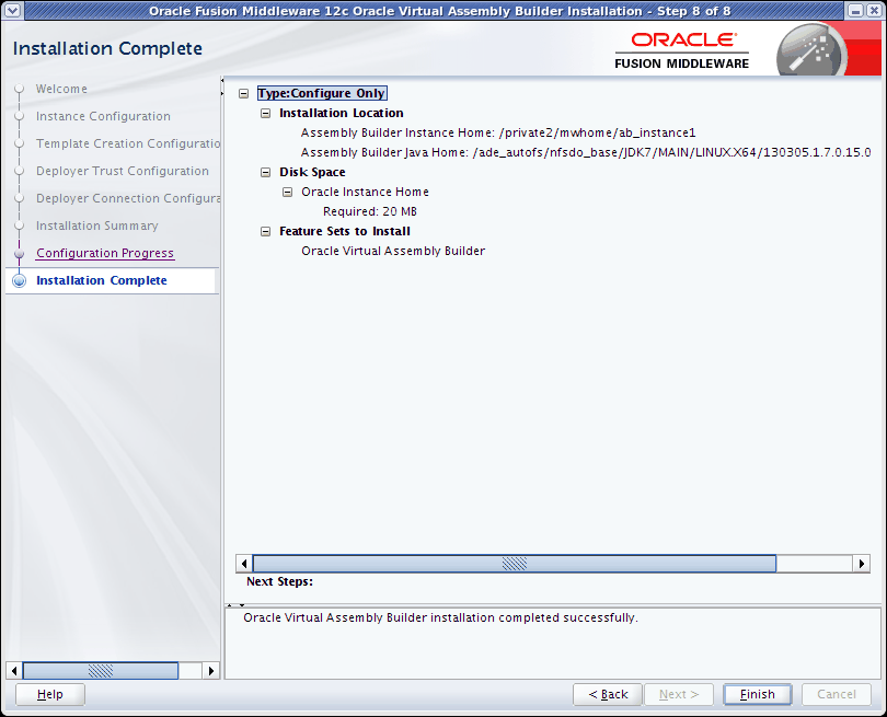 Instance Configuration. Enter, or choose, the Oracle Virtual Assembly Builder Instance Home, and the Oracle Virtual Assembly Builder Java Home.