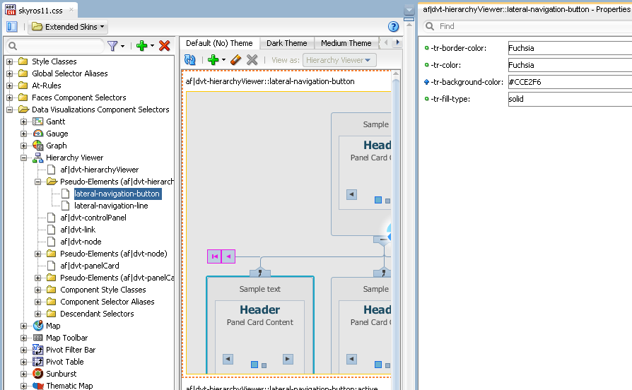 Many ADF Data Visualization component selectors, such as the selectors for the graph and hierarchyViewer components, expose pseudo-elements for which you configure ADF skin properties. These ADF skin properties modify the appearance of the area specified by the pseudo-element. The characters -tr- preface the names of ADF skin properties. For example, Figure 5-6 shows the properties of the hierarchy viewer's lateral-navigation-button selector, all of which are prefaced by -tr-.