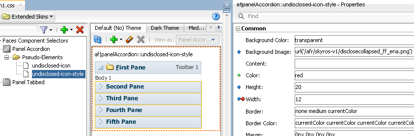 ADF skin selectors use two naming conventions for pseudo-elements that identify icon images that render in a component. The names of these pseudo-elements end in -icon or in -icon-style. Figure 2-4 shows the example of the Panel Accordion selector's pseudo-elements. Pseudo-elements that end in -icon-style specify a background image, as shown in Figure 2-4. In contrast, pseudo-elements that end in -icon do not specify a background image, but can reference IMG elements or text, as in the following examples: