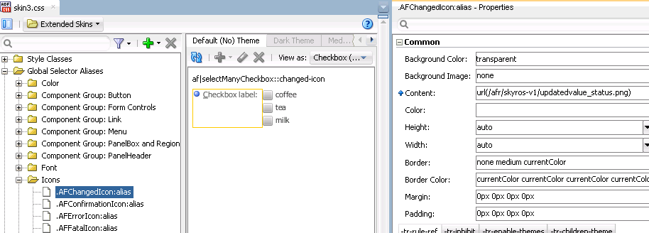The ADF skinning framework also defines a number of global selector aliases that specific icon images to use in different scenarios. These global selector aliases appear under the Icons node in the Selector Tree of the selectors editor, as shown in Figure 2-5. The .AFChangedIcon:alias shown in Figure 2-5 enables you to globally set the changed icon for all components using that icon.