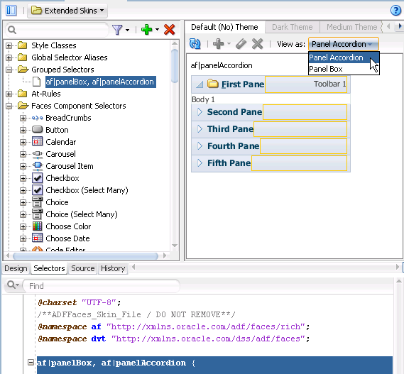You can group ADF skin selectors and global selector aliases to minimize the number of entries in the source file of the ADF skin. The selectors that you group render under the Grouped Selectors node in the Selector Tree, as shown in Figure 2-7. The View as list in the Preview Pane displays all the selectors that you grouped.