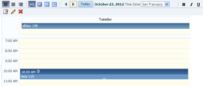 When these toolbar buttons are used, attribute values on the calendar are changed. You can configure these values to be persisted so that they remain for the user during the duration of the session. For more information, see Chapter 34, "Allowing User Customization on JSF Pages."You can also configure your application so that the values will be persisted and used each time the user logs into the system. For this persistence to take place, your application must use the Fusion technology stack. For more information, see the "Allowing User Customizations at Runtime" chapter of Developing Fusion Web Applications with Oracle Application Development Framework.