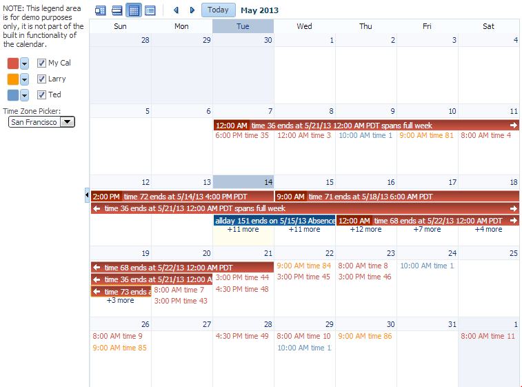 Implement any other needed functionality for the calendar. For example, you might add logic that sets the time zone, as in the oracle.adfdemo.view.calendar.rich.model.DemoCalendarBean managed bean in the ADF Faces demo application (for more information about downloading and installing the demo application, see Chapter 2, "ADF Faces Demo Application").
