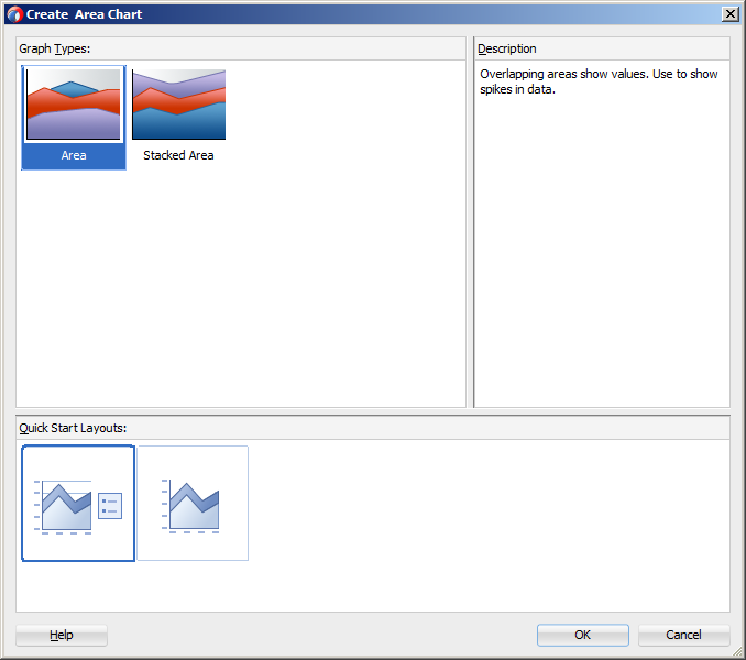 When you select a chart category in the Components window, JDeveloper displays a dialog with descriptions about the available chart types to provide visual assistance when you are creating charts. Figure 23-2 shows the different area chart types and layouts available when you select the Area chart in the Components window.