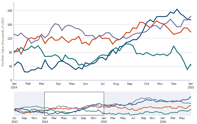 Figure 23-29 shows a line chart configured for scrolling with a view port. As the user moves the view port on the master line chart, the detail chart changes to reflect the selected range.