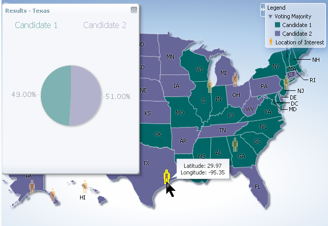 The thematic map component supports custom base maps and point data layers. For more information, see Section 28.7.6, "Defining a Custom Base Map."Area layers and labels: Each base map includes several regions that represent levels in a geographical hierarchy. For example, in the United States map the hierarchy is country > states > counties. The hierarchical relationship supports drilling in the region. When displayed, the cities associated with the base map will appear as data points. By default, each region in an area layer displays a label that can be customized.