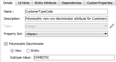 Note to use view row polymorphism with either view objects or entity objects, you must configure the discriminator attribute property separately for each. This is necessary because read-only view objects contain no related entity usages from which to infer the discriminator information.