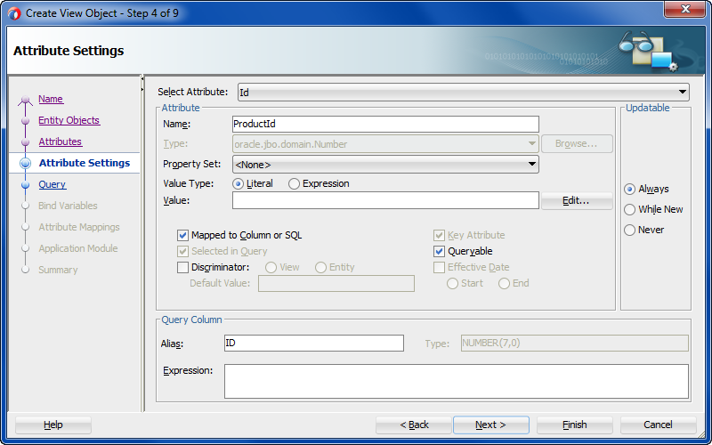 When you use the Create View Object wizard to create an entity-based view object, by default the attributes of the view object will be updatable. When you want to make all the attributes of the view object read-only, you can deselect Updatable when you add the entity object in the wizard. Later you may decide to convert the view object to one that permits updates to its SQL-mapped table columns. However, this cannot be accomplished by merely changing the attribute's Updatable property. You must delete the read-only view object and recreate the entity-based view object so that the intended attributes are updatable.