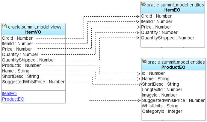 If you configure JDeveloper preferences to generate default Java classes for ADF Business Components, the wizard will also create an optional custom view object class (for example,ProductVOImpl.java) and/or a custom view row class (for example, ProductVORowImpl.java). For details about setting preferences, see Section 3.2.8, "How to Customize Model Project Properties for ADF Business Components."Figure 5-7 depicts the entity-based view object ProductVO and the singe entity usage referenced in its query statement. The dotted lines represent the metadata captured in the entity-based view object's XML document that map SELECT list columns in the query to attributes of the entity objects used in the view object.
