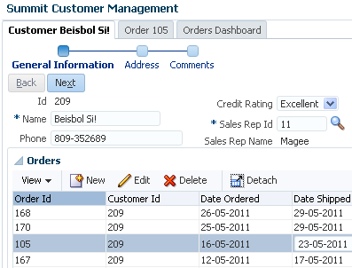 When objects have a master-detail relationship, you can declaratively create pages that display the data from both objects simultaneously. For example, the page shown in Figure 31-1 displays an entry for a customer in a form at the top of the page and a table of the customer's orders at the bottom of the page. This is possible because the objects have a master-detail relationship. In this example, the Customers view object is the master object and OrdersForCustomer is the detail object. ADF iterators automatically manage the synchronization of the detail data objects displayed for a selected master data object. Iterator bindings simplify building user interfaces that allow scrolling and paging through collections of data and drilling-down from summary to detail information.