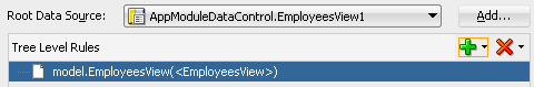 The master-detail hierarchy displayed in the Data Controls panel does not reflect the cardinality of the relationship (that is, one-to-many, one-to-one, many-to-many). The hierarchy simply shows which collection (the master) is being use to retrieve one or more objects from another collection (the detail).The master-detail hierarchy on the Data Controls panel reflects the hierarchy defined in the application module data model, as shown in Figure 31-4. For more information about the icons displayed on the Data Controls panel, see Section 17.4.1, "How to Use the Data Controls Panel."