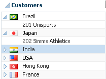 Figure 31-2 shows a tree that has two levels of nodes. You can use trees to display hierarchical information. In this example, a tree is used to display customers grouped by countries. The user can expand nodes to traverse down a branch of the tree to access the leaf items.