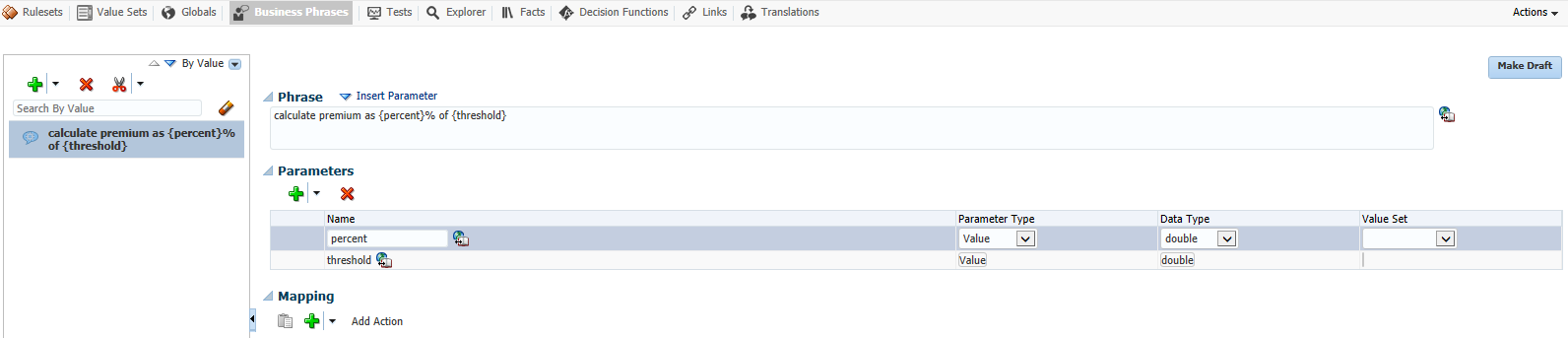 As you write a verbal rule you can compose business phrases that do not yet exist in the dictionary. These are automatically added to the list of business phrases and marked draft, and the verbal rule is marked draft as well.