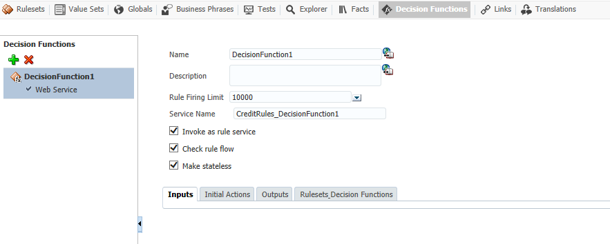 A decision function provides a contract for invoking rules from Java or Service-Oriented Architecture (SOA) (from an SOA composite application or from a BPEL process). The contract includes input fact types, rulesets to run, and output fact types.
