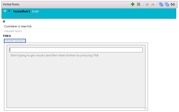 To create a verbal rule, first add the rule to a ruleset, and then insert tests and actions. As you define a verbal rule, you add business phrases which can either be automatically derived by the system, or defined by you. You can define business phrases before writing a rule, or after.