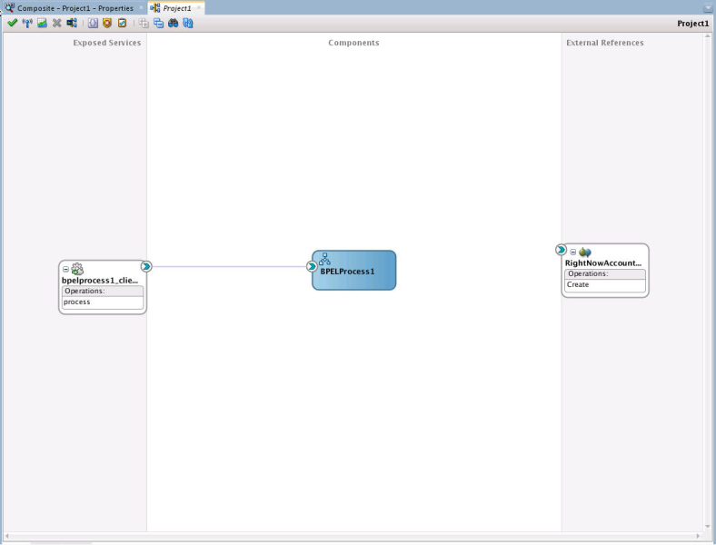Figure 5-23 BPELProcess1 and RightNowAccount External Reference Connected Through a Wire