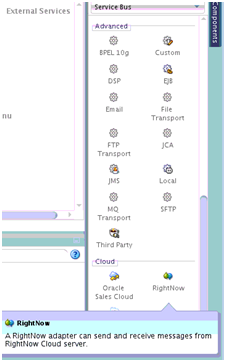 Drag and drop the Oracle RightNow adapter component from the Components panel to the External Services swim lane.