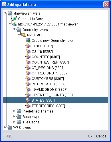 • Validate selected geometries: Validates the selected feature geometries. If any invalid geometry is found, a dialog box is displayed with the invalid Oracle Spatial and Graph codes (For detailed information about geometry validation and error codes, see the reference material about the SDO_GEOM.VALIDATE_GEOMETRY_WITH_CONTEXT function in Oracle Spatial and Graph Developer's Guide.)
