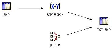 The following figure shows an OWB mapping for which two operators are connected to the same operator TGT_EMP. The EXPRESSION operator has an upstream source operator, while the JOINER operator does not. Only one map component can be connected to TGT_EMP in ODI. As a result, the operator with no upstream source operator will lose the connection to TGT_EMP.