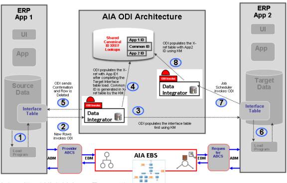 Whenever a need exists for a high-volume data transfer, AIA recommends using the Oracle Data Integrator solution for data transfer between applications. Using this approach, the Oracle Data Integrator package transfers data from source to target system on a regular basis.