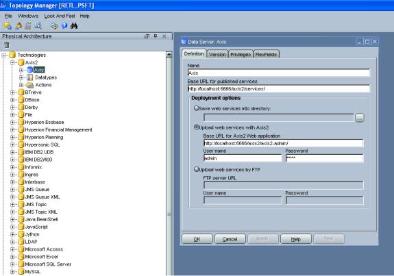In Topology Manager's Physical Architecture view, select the Axis2 technology. Right-click and select Insert Dataserver. If you are using a different Web Services container, then choose the appropriate technology instead.