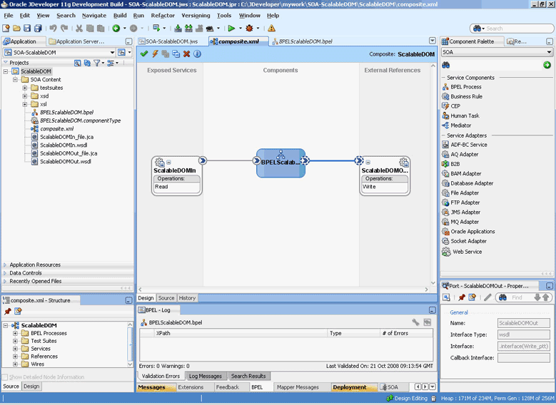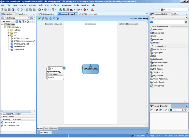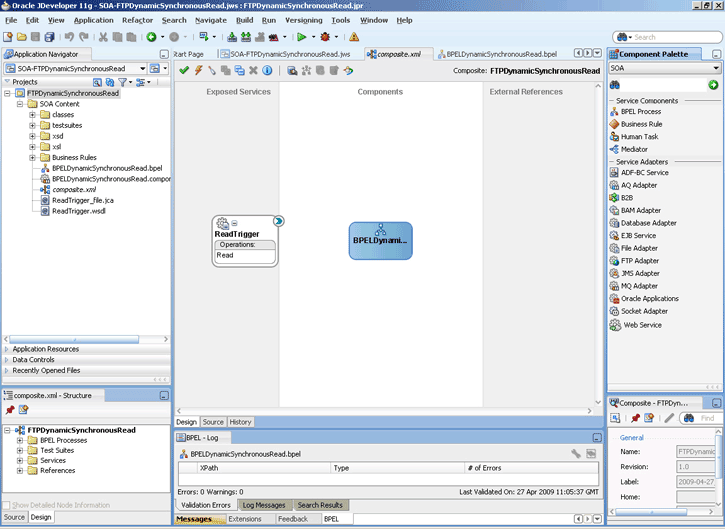 A composite is an assembly of services, service components (Oracle BPEL PM and Mediator), wires, and references designed and deployed in a single application. The composite processes the information described in the messages. The details of the composite are stored in the composite.xml file. For more information about integration of the Oracle File and FTP Adapters with SOA composite, see Oracle SOA Composite Integration with Adapters.