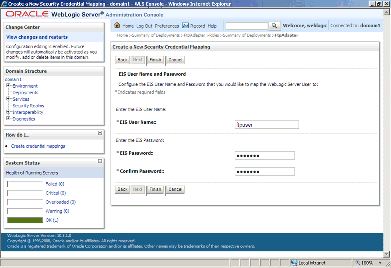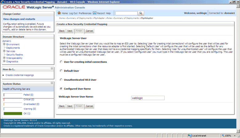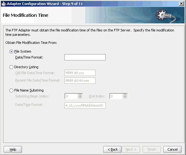 This wizard enables you to select and configure the Oracle File and FTP Adapters. When configuration is complete, a WSDL, JCA file pair is created in the Application Navigator section of JDeveloper. This JCA file contains the configuration information you specify in the Adapter Configuration Wizard.