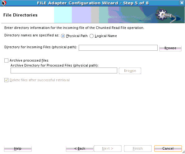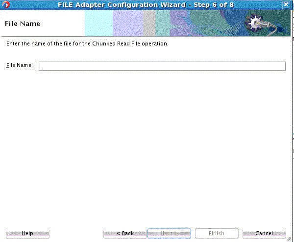 You also select Chunked Synchronous Read as the WSDL operation, using the File Adapter Configuration Wizard; you optionally use the Configuration Wizard to configure the file input directory and the filename which are placed in the ChunkedInteractionSpec.