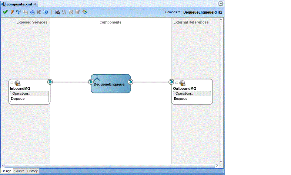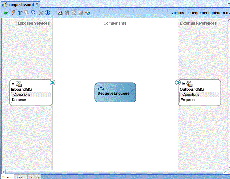 Drag the small triangle in the BPEL process in the Components area to the drop zone that appears as a green triangle in the OutboundDequeueService in the External References area.