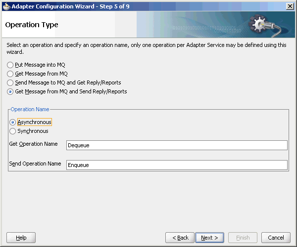 This wizard enables you to select and configure the Oracle MQ Series Adapter. When the configuration is complete, a WSDL file of the same name is created in the Application Navigator section of JDeveloper. This WSDL file contains the configuration information you specify in the Adapter Configuration Wizard.