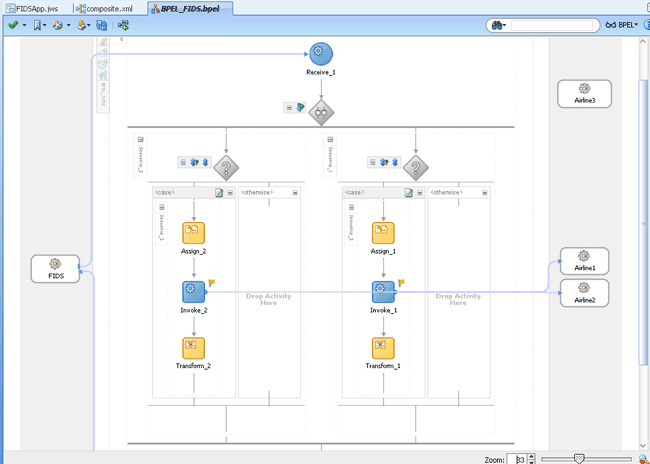 Click File, Save All. The BPEL_FIDS.bpel page is displayed, as shown in Figure 5-113, with the flow defined for the Airline3 server.