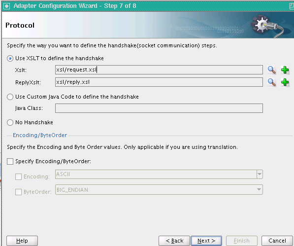 To define a handshake using style sheet, you must select Use XSLT to define the handshake and browse to select the XSL file in the Protocol page, as shown in Figure 5-8.