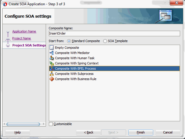 Select Composite With BPEL Process from the Standard Composite list, and then click Finish. You have created a new application, and a SOA project. This automatically creates a SOA Composite.