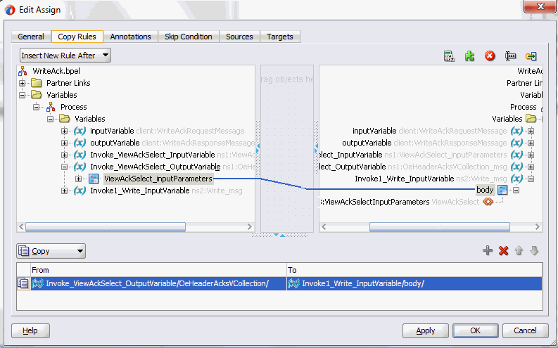 Drag the source node (ViewAckSelect_inputParameters) to connect to the target node (body) that you just specified. This creates a line that connects the source and target nodes. The copy rule is displayed in the From and To sections at the bottom of the Edit Assign dialog box.