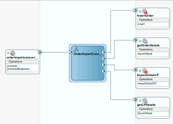 Navigate to SOA folder and click OrderImportConcurrentProgram (composite.xml) to view the composite diagram.
