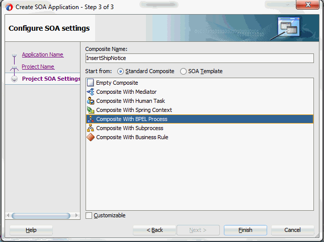 Select Composite With BPEL Process from the Standard Composite list, and then click Finish. You have created a new application, and a SOA project. This automatically creates a SOA Composite.