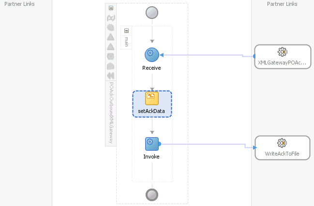 An asynchronous BPEL process is created with the Receive and Reply activities. The required source files including bpel and wsdl, using the name you specified (for example, POInboundXMLGateway.bpel and POInboundXMLGateway.wsdl) and POInboundXMLGateway (composite.xml) are also generated.